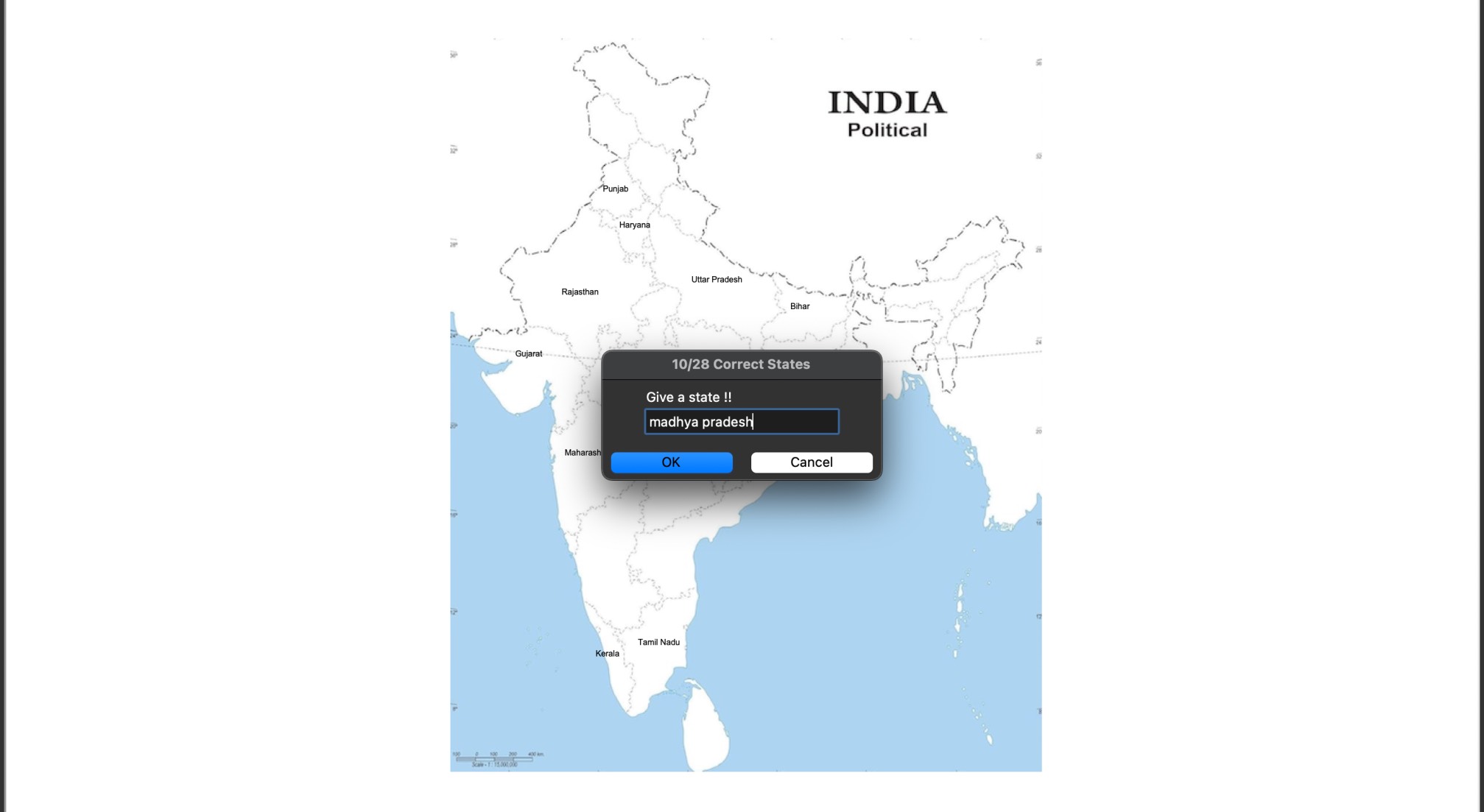 This Python script creates an interactive game using Turtle and pandas, where users can guess Indian states or Union Territories based on their locations.