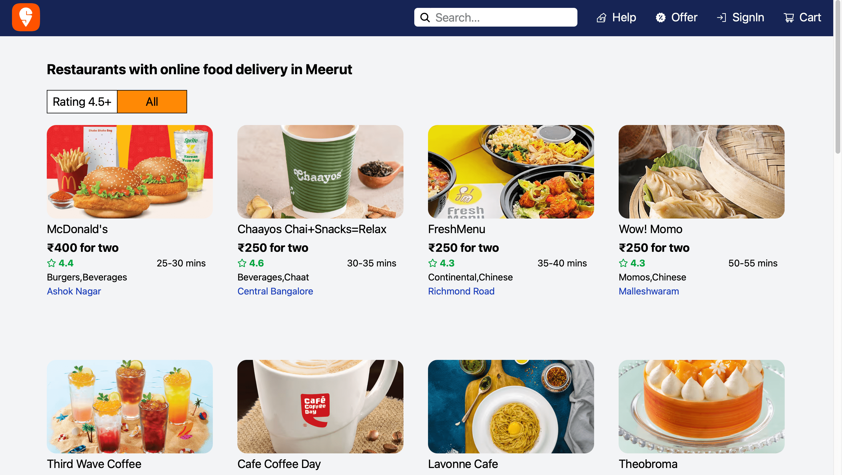 A dynamic and responsive food ordering web application featuring restaurant listings, interactive menus, cart functionality, and seamless navigation, designed to enhance the user’s online food ordering experience.