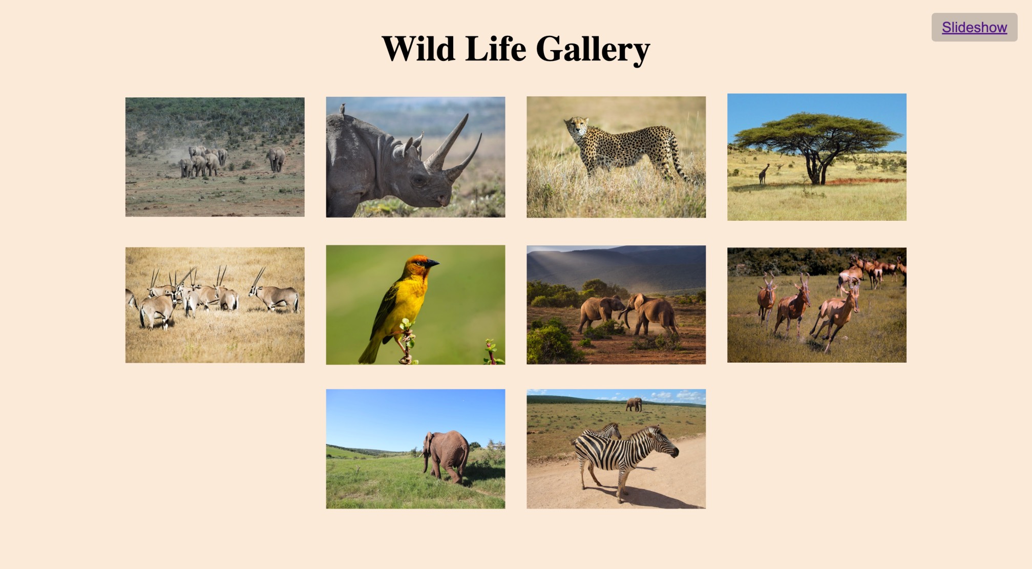 An image gallery displays thumbnails of wildlife photos. Clicking on an image opens it in a larger view with a close button.